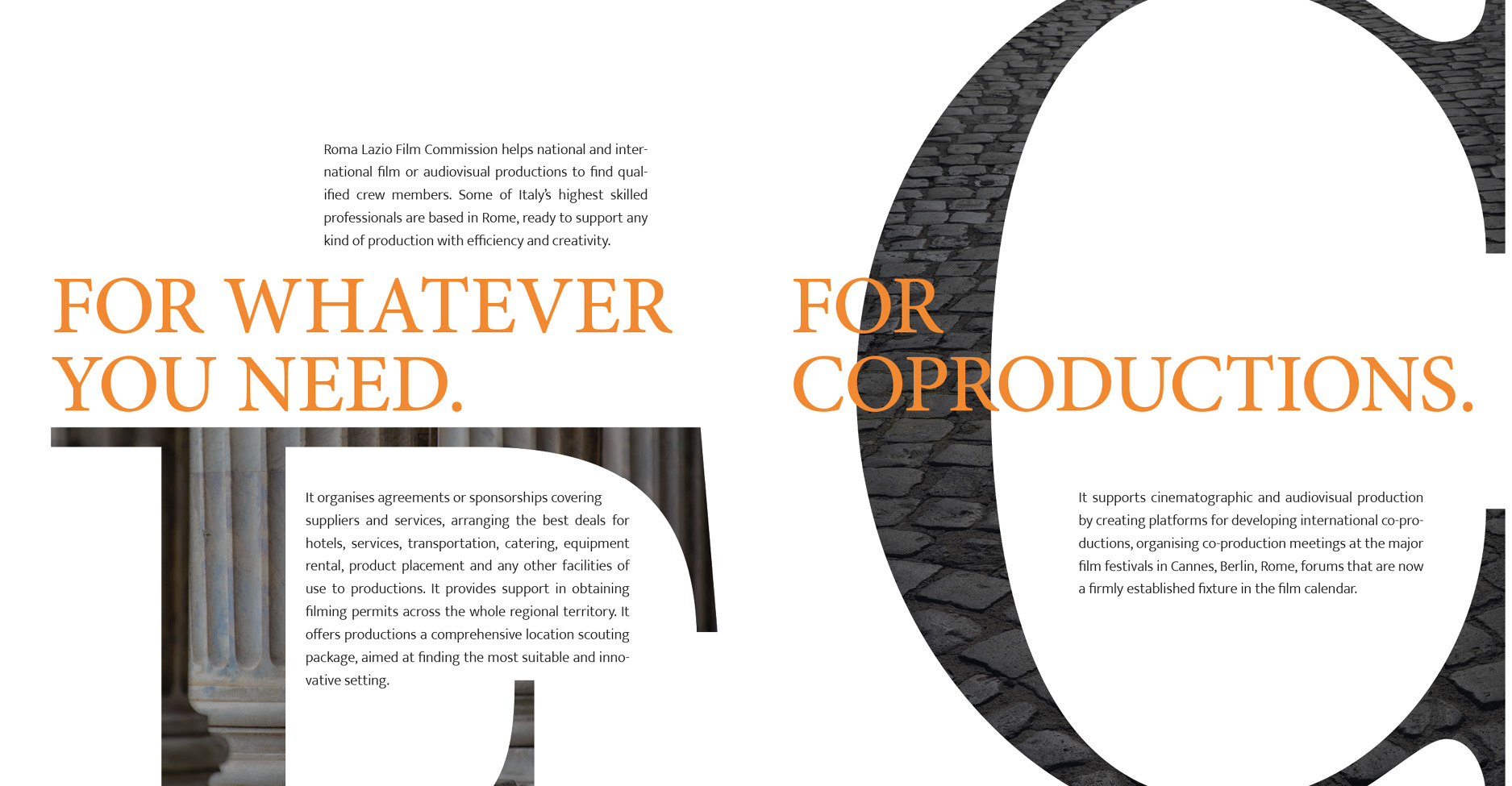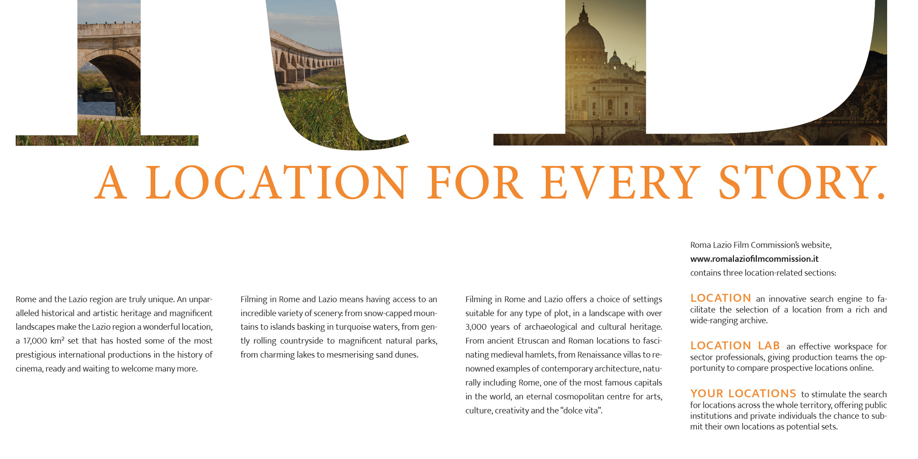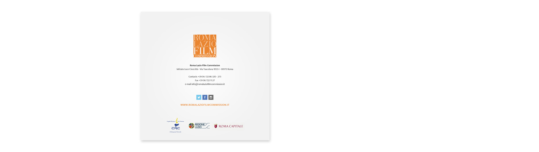 Roma Lazio Film Commission was created thanks to the common resolve of the the Municipality of Rome, the Province of Rome, the Lazio Region, with the aim of developing the movie and audiovisual industry across the Rome and the Lazio territory. This powerful synergy of local authorities enables it to maximise efficiency in supporting film and audiovisual ventures, whether they be national or international, undertaken in Rome and the Lazio region. Production companies are offered assistance at every stage of the production process, from project development to post-production and the eventual premiere. Furthermore, Roma Lazio Film Commission encourages filmmaking, audiovisual projects and co-productions, acting as an axis between the principal international production companies and Rome with the Lazio region, land of cinema with an outstanding tradition. It is a member of various national and international industry bodies: the Association of Film Commissioners International (AFCI); the Italian Film Commissions (IFC); and the European Film Commissions Network (EUFCN), and is a partner in the CRC Capital Regions for Cinema network of European regional capitals.