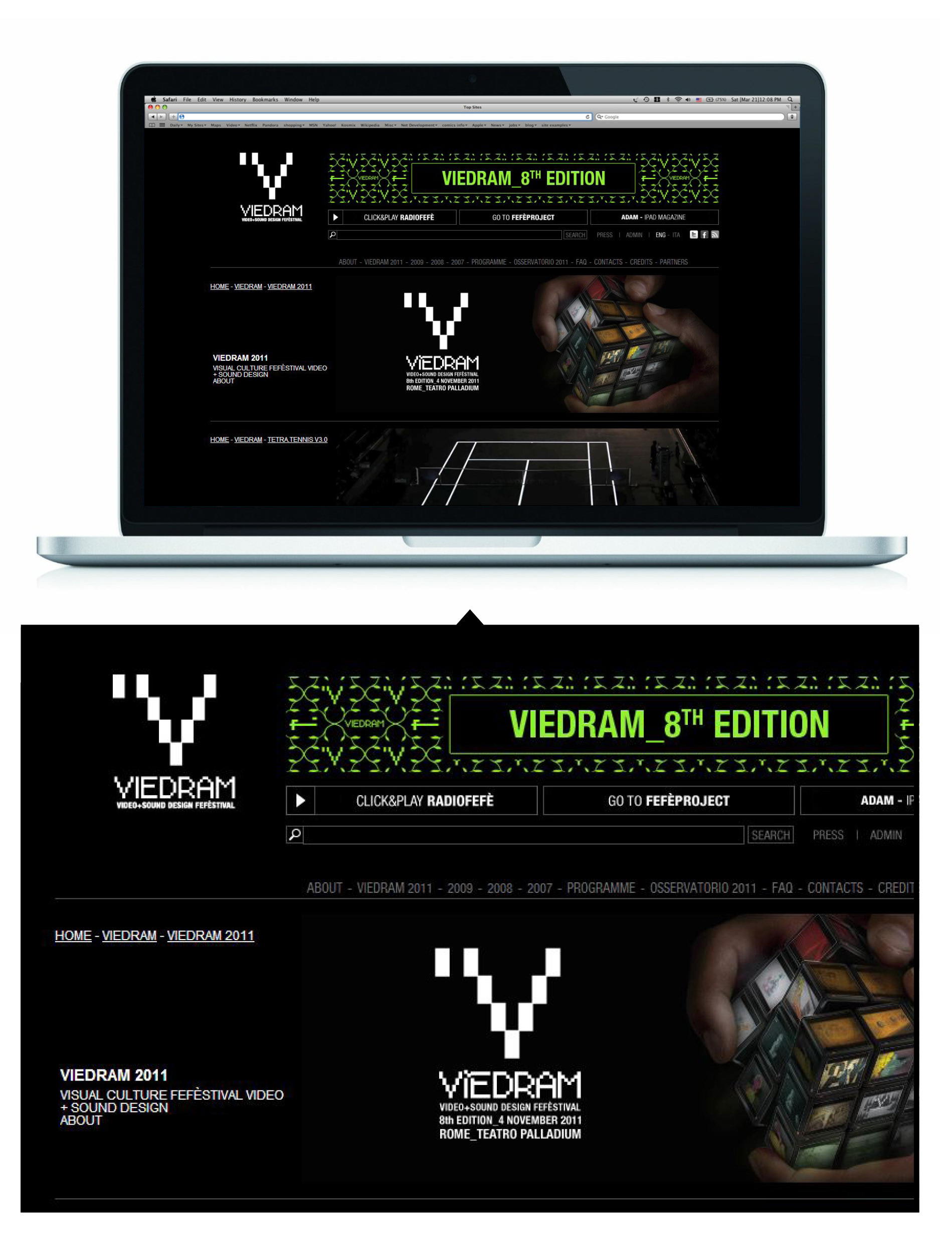 VIEDRAM_VISUAL CULTURE FEFÈSTIVAL_VIDEO+SOUND DESIGN is the international festival dedicated to the new frontiers of sound and motion graphics, organized by Fefè Project and Istituto Europeo di Design. The festival, which is now in its 8th edition, will be held on November 4, at the Palladium Theatre of Rome, within the Digitalife 2 program and the “Risonanze” Section of the Rome International Film Festival. The festival offers a rich program of events, which will take place in a single day. In the morning there will be a conference on “iPad Magazine and New Languages. Video Design, Motion Graphics and Frontiers of Digital Publishing”, with Italian and international experts. The afternoon will be dedicated to meetings with authors and a focus on the best of international festivals, such as “Pictoplasma”, one of the most important motion graphics festivals in the world. Later on, there will be a spectacular lecture/performance by LASAL – a VJ and computer artist from Berlin, among the most highly rated programmers using the open-source software called VVVV – and the presentation of MObIE, a software application for the creation and reproduction of interactive films where the visual content changes according to the user’s cerebral activity. All those who are interested in digital publishing should not be missing the presentation of ADAM, the first art magazine designed for the iPad, an absolute novelty in the field. Finally, from 9.30 p.m. there will be an international observatory with screenings of over 40 videos selected and divided into seven categories: Short Film; Videoclip; Sound; TV; Commercial; Titles; Mapping.