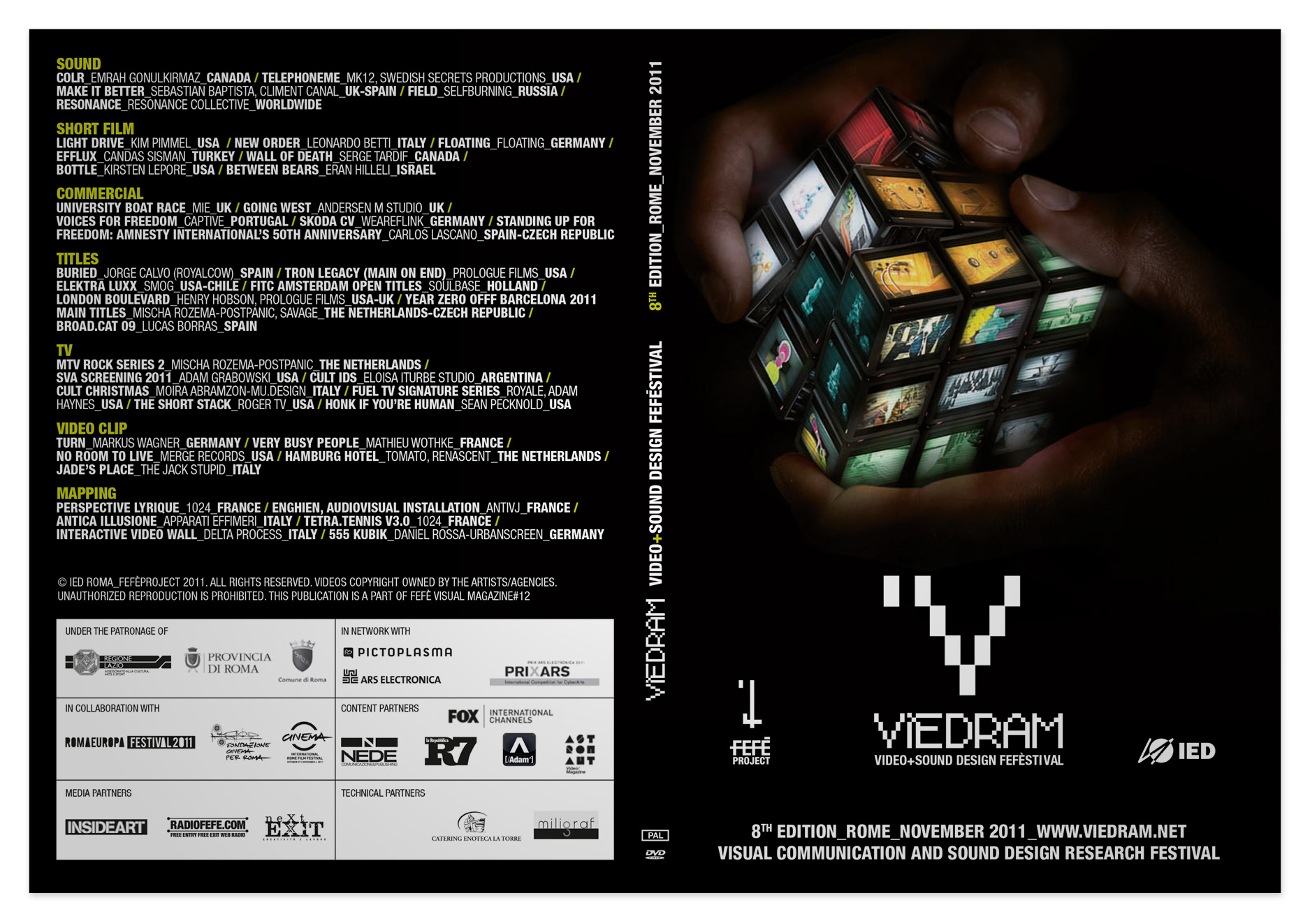 VIEDRAM_VISUAL CULTURE FEFÈSTIVAL_VIDEO+SOUND DESIGN è il festival internazionale dedicato alle nuove frontiere del suono e dell’immagine in movimento. Un evento che, nel settore del video, sound design e motion graphic, copre un segmento che nessun altro, in Italia, occupa. Nato nel 2003 da un’idea di Luigi Vernieri, direttore della Scuola di Visual Communication dell'Istituto Europeo di Design di Roma e fondatore della piattaforma creativa Fefè Project, è stato realizzato in tutte le sue edizioni in collaborazione con IED Roma e in due edizioni è stato inserito nel cartellone di “Cinema, Festival Internazionale del Film di Roma”. VIEDRAM, crasi tra le parole “Video”, “IED” e “Ram”, è un osservatorio che seleziona i migliori prodotti audio e video, dando loro visibilità, e promuove i nuovi autori del digitale. Dall’edizione 2009 ha allargato il campo di sperimentazione anche al sound design. Scopo del festival è scoprire e promuovere le nuove firme dei linguaggi audiovideo e, al tempo stesso, avvicinare un pubblico giovane, colto e tecnologicamente evoluto ai linguaggi della creatività contemporanea. VIEDRAM, oltre ad esplorare i nuovi scenari che si aprono grazie allo sviluppo della tecnologia, conduce ormai da anni un’attenta ricerca delle realtà più interessanti del video design ed esplora gli ambiti in cui questa forma di comunicazione è presente nel nostro quotidiano. Nell'edizione 2011 VIEDRAM avrà come obiettivo quello di aprire il ventaglio dei rapporti internazionali attirando a Roma i protagonisti che hanno ottenuto riconoscimenti in altri paesi e, al tempo stesso, di approfondire il rapporto con il territorio, dedicando una sezione alla valorizzazione delle imprese locali dell'audiovisivo. Nel programma di quest'anno i momenti salienti saranno affidati a un convegno che indaga le frontiere dei linguaggi del digitale con esperti di levatura internazionale e a una serie di focus e di incontri “d'autore” con personalità che, sulla scena mondiale, dirigono festival e piattaforme. Non mancherà nell'osservatorio internazionale una rassegna dei migliori esempi di video e sound design selezionati tra le produzioni recenti. VIEDRAM 2011 sarà l’occasione per presentare una novità assoluta nel mondo della comunicazione e dell'editoria digitale: una creazione di Fefè Project, sviluppata con gli studenti IED, per spostare in avanti i confini del rapporto tra magazine, immagine in movimento e sound design. Il festival, che si svolgerà a Roma, il prossimo 4 novembre, al Teatro Palladium, costituirà dunque un’occasione d’incontro e di scambio nel campo della cultura visiva e nel settore dell’audiovisivo in una città che è al centro di un network strategico che vede nel Lazio la presenza del 69% del totale nazionale delle imprese cinematografiche e audiovisive e del 27% degli occupati nazionali nel settore. L’ingresso gratuito agli appuntamenti e all’osservatorio permetterà il libero accesso a un pubblico vasto, diversificato e interessato ai cambiamenti e alle innovazioni nel mondo dell’immagine e del suono.